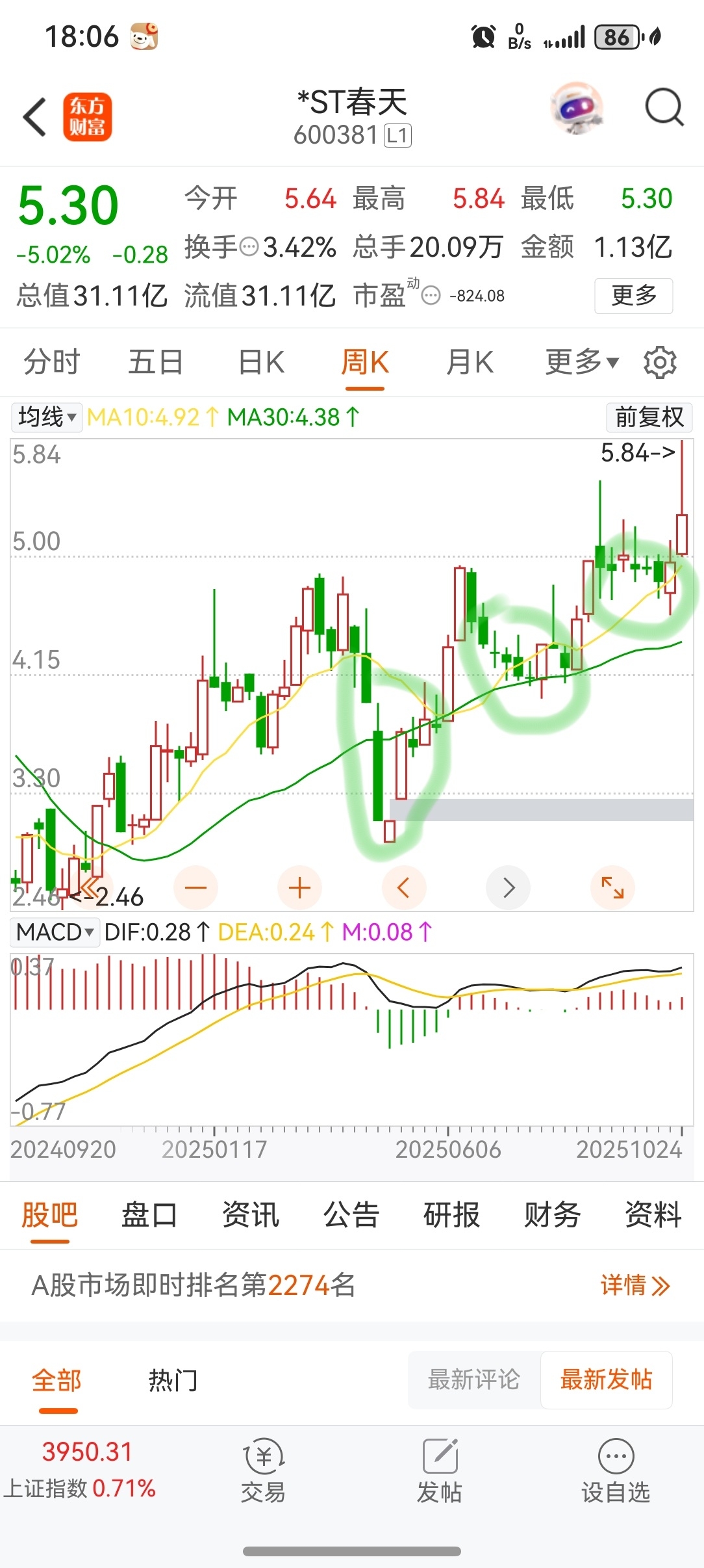 $*ST春天(SH600381)$ 技术面显示周K波动率越来越低。上周可否视为突破前的试探?试探上方的抛压?