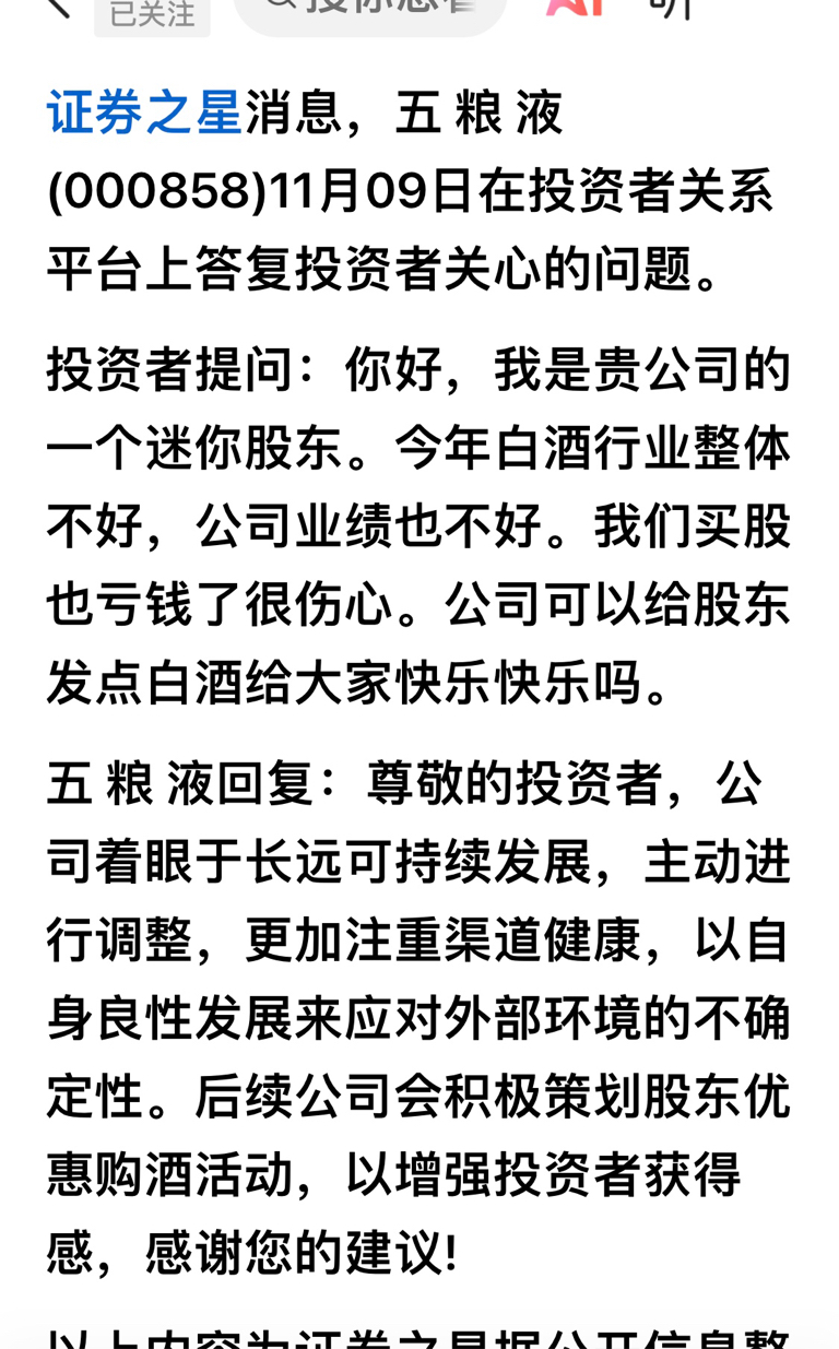 $*ST春天(SH600381)$ $五 粮 液(SZ000858)$ 人家五粮液就快推出股东优惠购酒活动了,建议听花酒也为回馈股东亦是增加营收推出股东优惠购酒活动!建议:1.凡是持股10000股的股东可半价购买听花标准装一瓶,以此类推最多可购买100瓶!2.凡是持股10万股以上的股东,除购酒优惠外,均免费赠送听花标准装品鉴用酒一瓶!