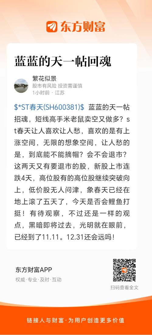 $*ST春天(SH600381)$ 蓝蓝的天一帖招魂,短线高手米老鼠卖空又做多?st春天让人喜欢让人愁,喜欢的是有上涨空间,无限的想象空间,让人愁的是,到底能不能摘帽?会不会退市?这两天又有要退市的股,新股上市连跌4天,高位股有的高位股继续突破向上,低价股无人问津,象春天已经在地上滚了五天了,今天是否会鲤鱼打挺!有待观察,不过还是一样的观点,黑暗即将过去,光明就在眼前,已经到了11.11。12.31还会远吗!