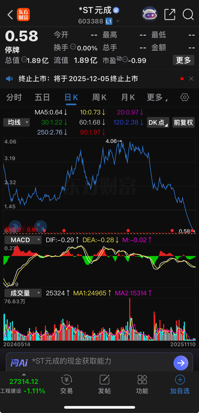 我分析春天的走势可能类似于603388的元成,开始退市的凶险之路前先涨一两个停板