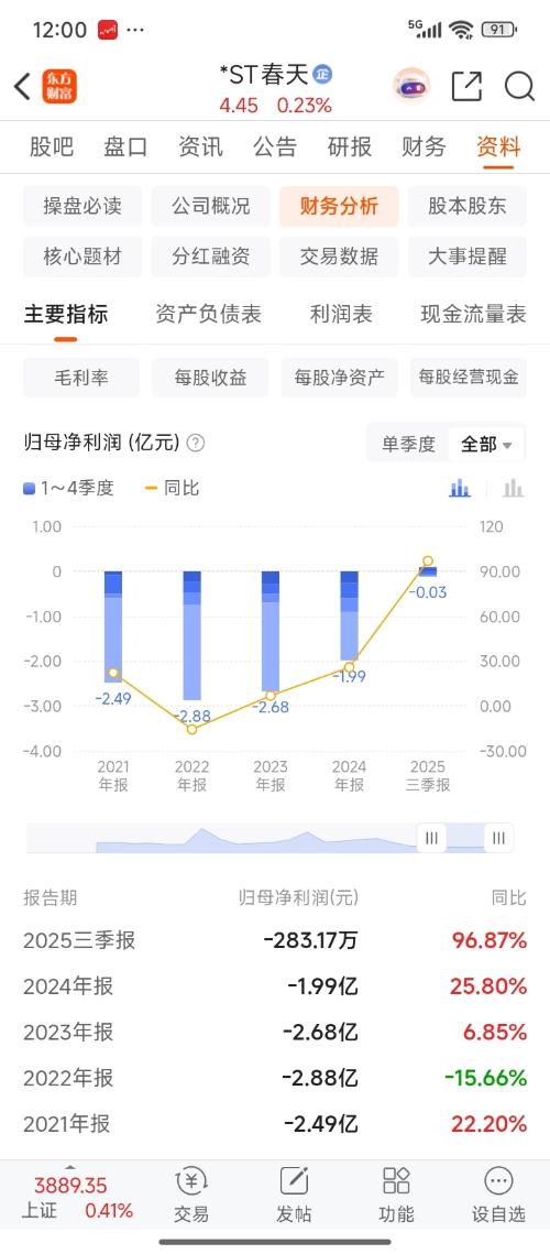 *ST春天,4.42买入,后来4.10割肉绝大部分,利下持股成本很高,为什么没有等到拉高出货5.84时候获利出来,也许是要做一些操作失败亏损股票,出来的钱换股凯瑞德在7.45卖出,相当于现在股价春天股价一样,是海昌新材出来捣浆糊的,无所谓。最新公告,公司已经很努力改变现状,现在重点是营业额,应该可以实现,但是提醒满仓的,注意风险。告诉一个真实故事,我当年持股*ST金泰,不是现在的*ST金泰,当时的*ST金泰公告业绩快报没事,股价自然两位数,可是4月份就要公告年报,突然公告年报改造,原来盈利变成亏损,披露年报就停牌等待是否终止上市,晴天霹雳,连续跌停板到停牌,最后我退市整理期开盘集合竞价1才出逃成功。我不是怀疑春天没有实现3亿营业额的努力,但是我有怀疑差一点点达不到3亿的权利,所以小心就是,一切都有可能。