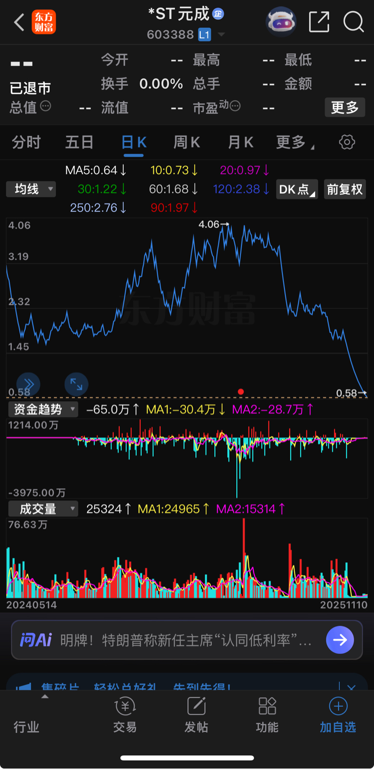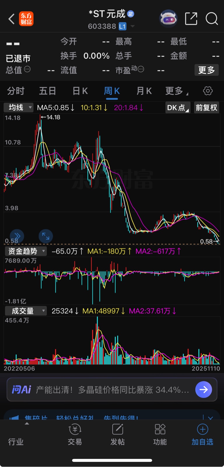 必须高度警惕:过几天再来个退市风险警示就完蛋了!非常担心会不会就是退市元成的走势