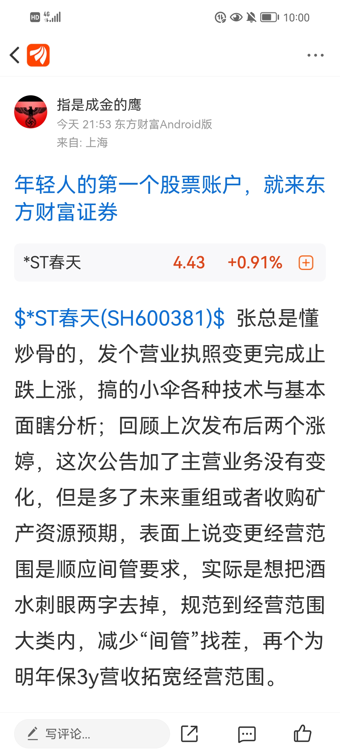 温馨提示: 1.根据《证券法》规定,禁止编造、传播虚假信息或者误导性信息,扰乱证券市场;2.用户在本社区发表的所有资料、言论等仅代表个人观点,与本网站立场无关,不对您构成任何投资建议。用户应基于自己的独立判断,自行决定证券投资并承担相应风险。《东方财富社区管理规定》