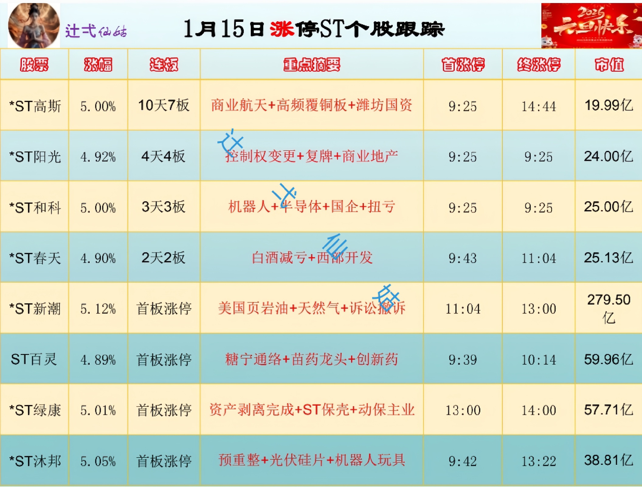 1月15日涨停ST个股小红花情况b组: