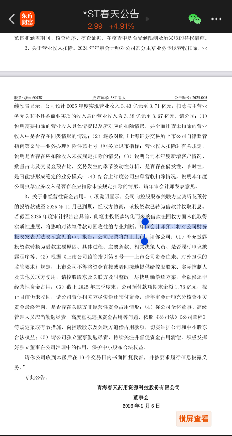 $*ST春天(SH600381)$ 仔细阅读截图中的这句话,这个是结论,如果是投资款不还——退市!如果是借款,还了也是退市!现在没有还,会计师都不好判断是投资款还是借款,但你说把投资款转借款了有没履行信披手续,触发内控,就直接非标退市!