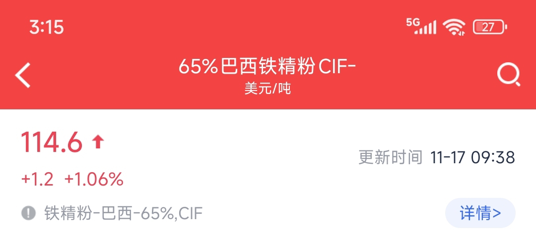 1.11月:震荡调整为主:当前国内铁精粉产量持续回落,1 - 9月累计产量同比减少,且11月华北产能复工节奏与环保政策存在不确定性,一定程度限制供给。但需求端持续疲软,叠加铁元素供给过剩矛盾未解决、累库现象持续,月初已有唐山、辽东等地铁精粉价格小幅下调,机构也预测本月铁矿价格震荡,难以突破前期高点。