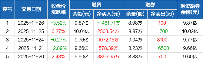 融资方面,当日融资买入6416.63万元,融资偿还7898.35万元,融资净偿还1481.71万元。融券方面,融券卖出100股,融券偿还0股,融券余量8.98万股,融券余额31.97万元。融资融券余额合计9.87亿元。
