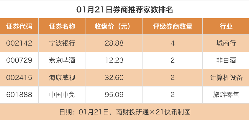 从券商推荐家数来看,1月21日有30家上市公司得到券商推荐,其中宁波银行获得4家推荐,燕京啤酒、海康威视等获得2家推荐。