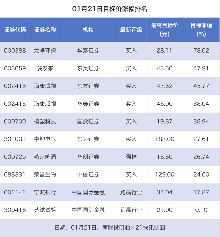 南财投研通数据显示,1月21日,券商给予上市公司目标价共10次,按最新收盘价计算,目标价涨幅排名居前的公司有龙净环保、璞泰来、海康威视,目标价涨幅分别为78.02%、47.91%、45.77%,分别属于环保设备、电池、计算机设备行业。