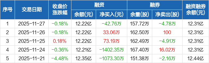 五矿资本:融资净偿还42.76万元,融资余额12.22亿元(11-27)