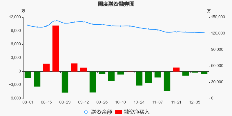 五矿资本本周(2025/12/08-2025/12/12)累计跌幅达2.69%,截至12月12日最新股价报收5.43元。从增量上来看,12月8日至12月12日融资买入交易规模1.29亿元,融资偿还规模1.35亿元,期内融资净偿还583.08万元。从存量上来看,截止12月14日,五矿资本融资融券余额12.28亿元,其中融资余额规模12.18亿元,融券余额规模985.16万元。