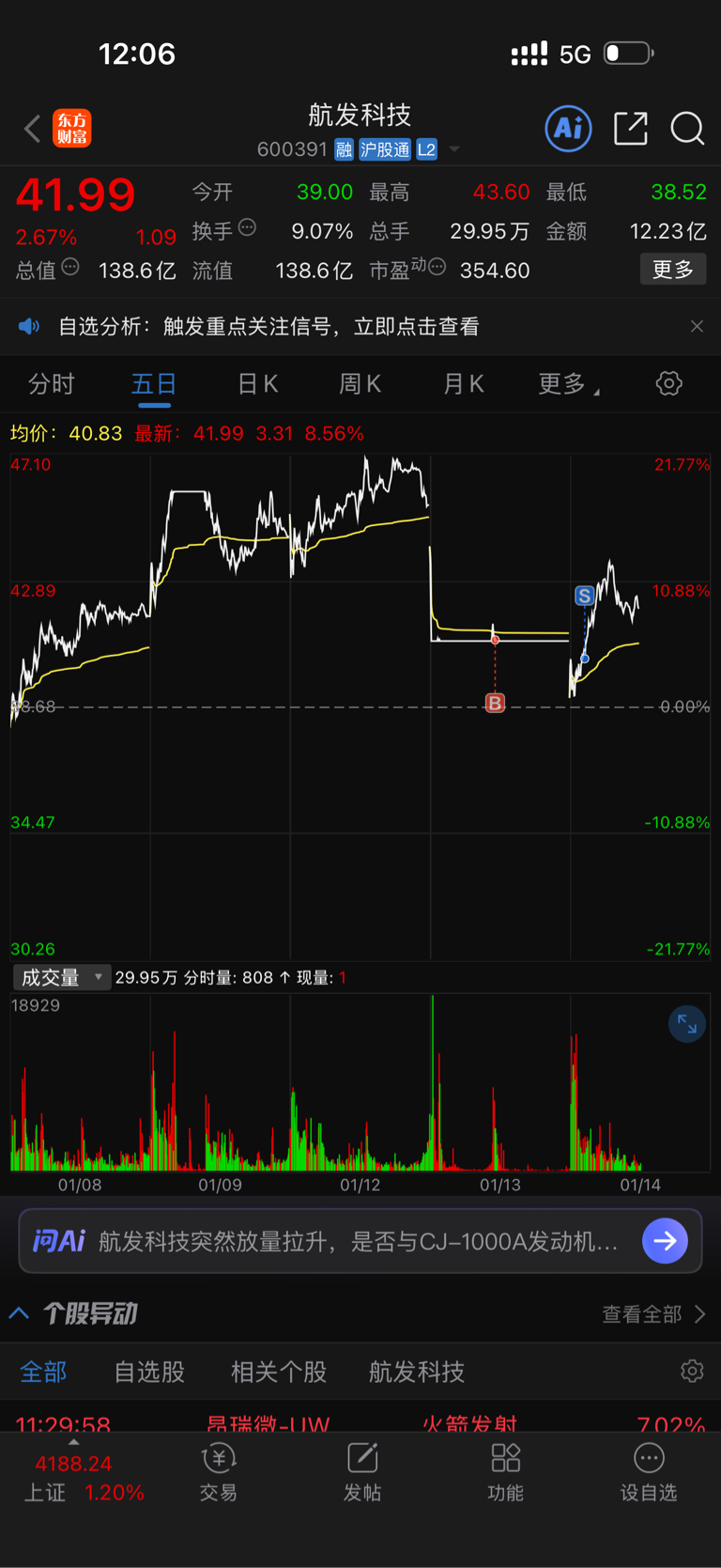 $航发科技(SH600391)$ #复盘记录# 翘板买是因为前两日上方高位筹码比很多航天个股筹码多,且主线不会一次结束,今天的卖点处理很差,改进:看分时成交再决定买卖,同板块很多个股已下杀到无量了,此时该股还在上涨,应继续持有。 正确操作是早盘巨量承接不破时做正T。