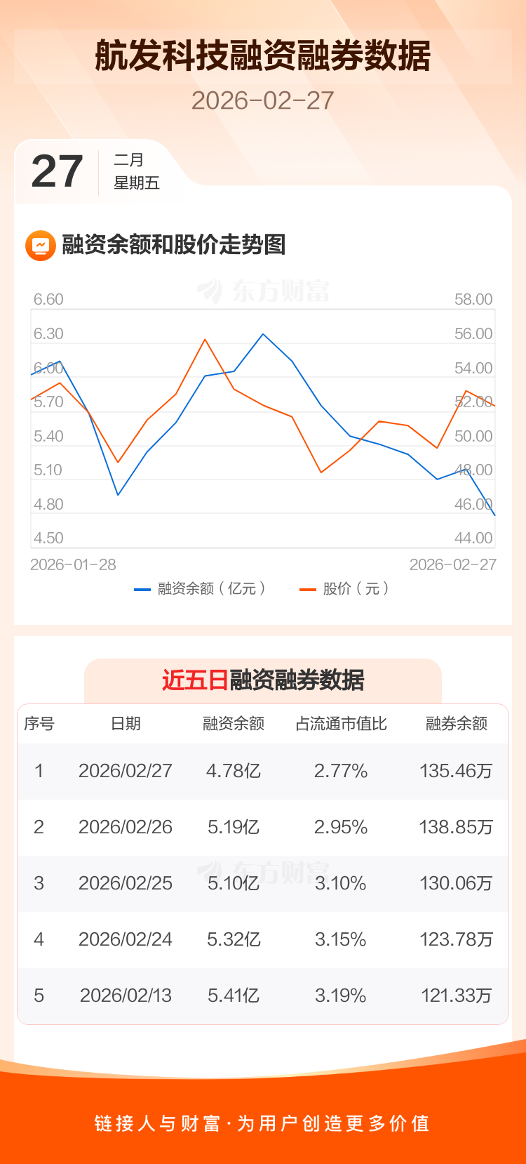 交易所最新数据显示,航发科技于2026年2月27日获融资买入1.26亿元,融资偿还1.67亿元,当日融资净偿还4096.09万元。目前,该股融资余额4.78亿,占流通市值比例为2.77%。