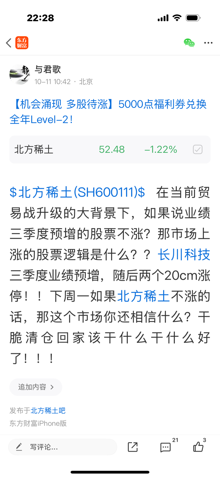 $盛和资源(SH600392)$ 上午我在北方稀土贴吧里发的帖子!大家可以看一下!!北方稀土周五发的三季报预增消息真是及时雨!!有北方稀土托底,还有什么可担心。下周一如果北方稀土不涨!那市场还有什么可留恋的,我会一键清仓!退出市场!!