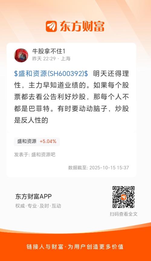 $盛和资源(SH600392)$ 明天还得理性,主力早知道业绩的。如果每个股票都去看公告利好炒股,那每个人不都是巴菲特。有时要动动脑子,炒股是反人性的