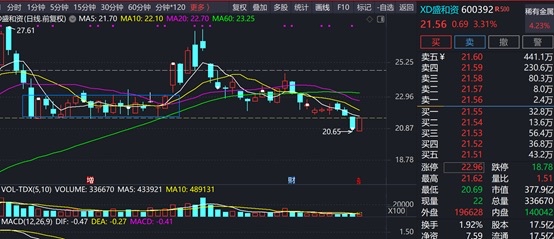 盛和资源昨日跌破颈线位置,今日早盘出现反弹,午盘收盘又接近了颈线位置,下午重点观