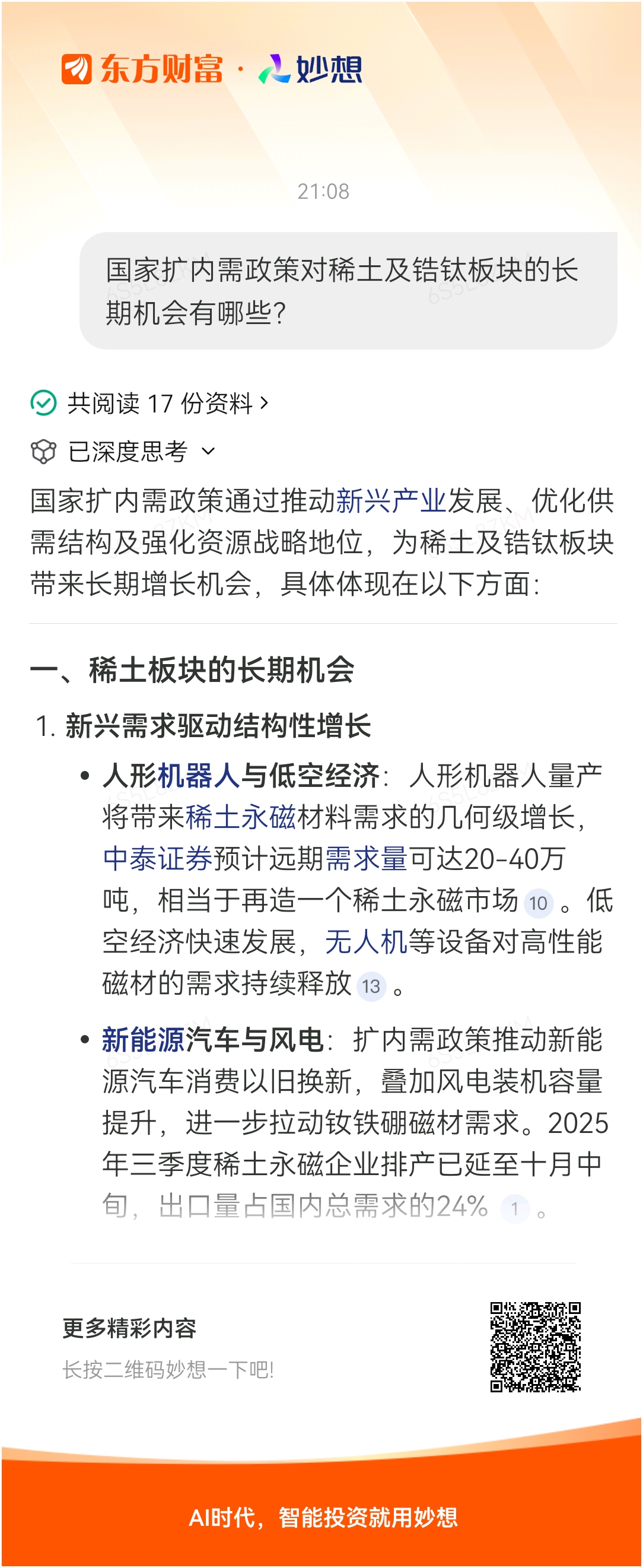 妙想一下:国家扩内需政策对稀土及锆钛板块的长期机会有哪些?