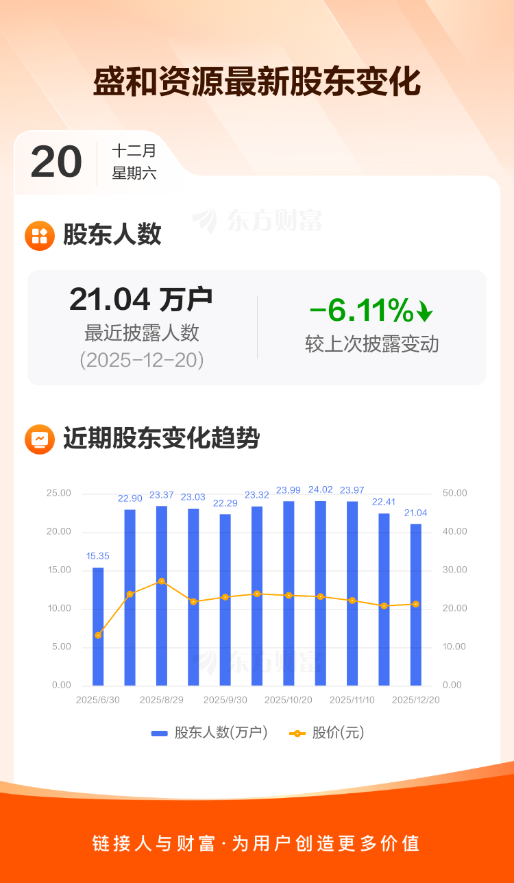 盛和资源:截至12月20日最新股东户数21.04万户,较上期减少6.11%