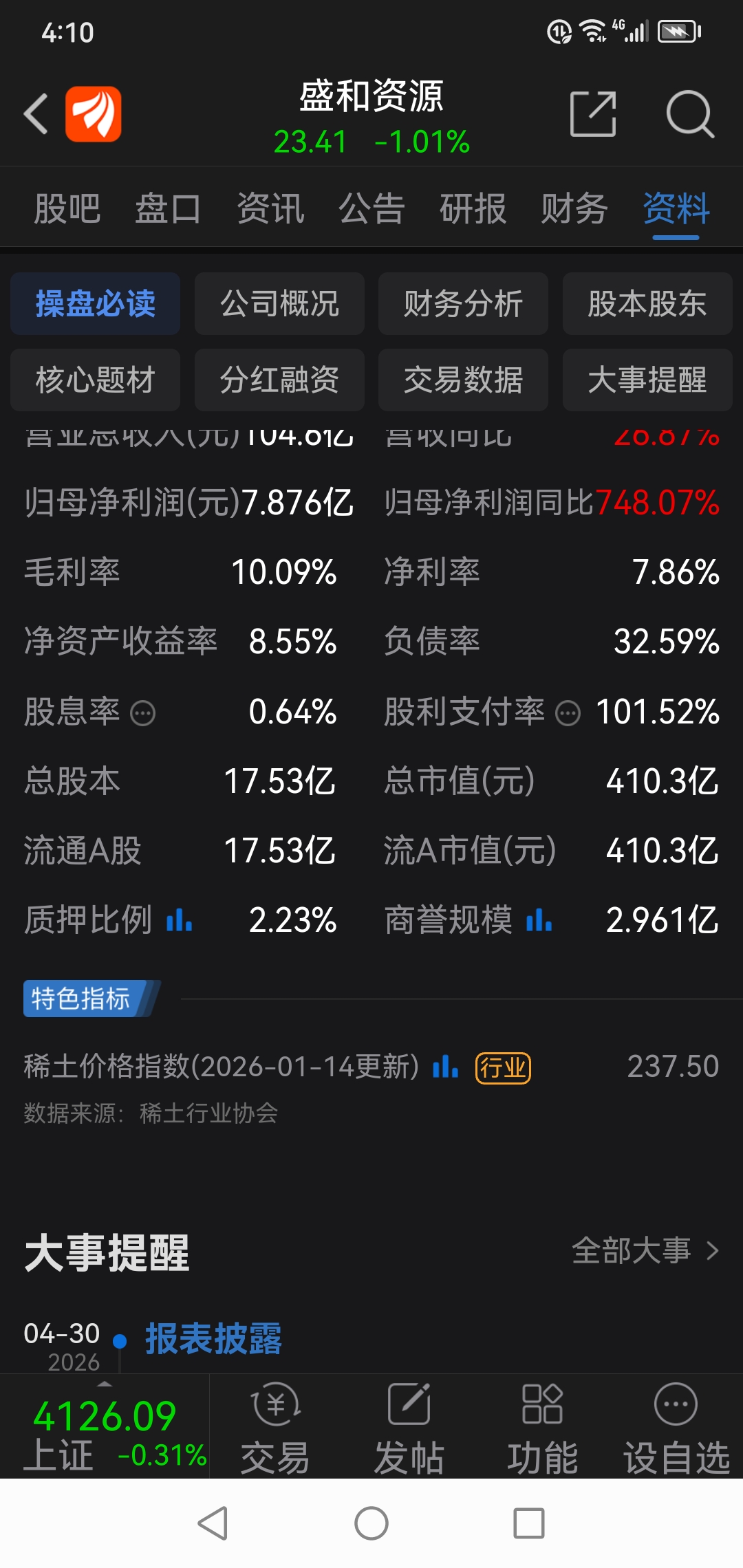 $盛和资源(SH600392)$ 找法:资料页面→操盘必读→特色指标小字下边→再点下这数据→图片就出来了。祝你发财!矿价已涨到历史顶点了,稀土企业个个发财,股价能不涨吗?别被大盘吓唬,抓住根本必发财!