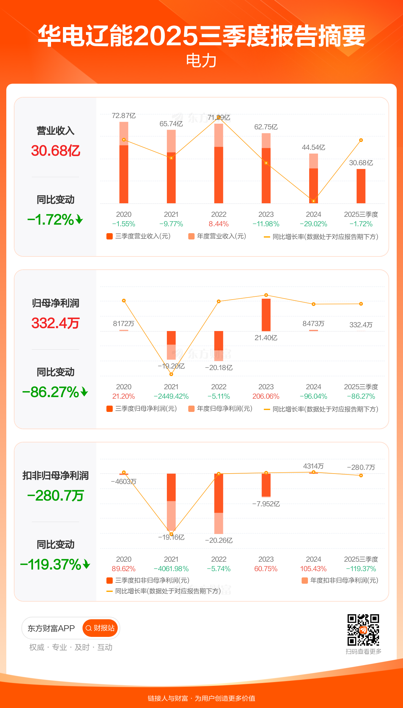 图解财报:华电辽能前三季归母净利润332.42万元,同比减少86.27%
