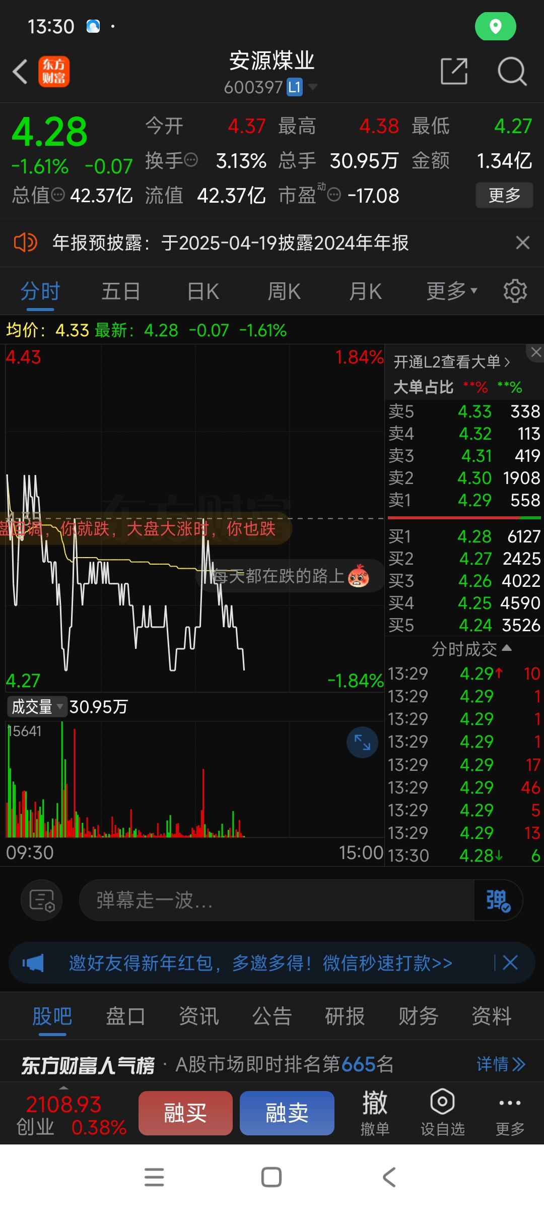 $安源煤业(SH600397)$ 唉,今天的低点就是明天的高点