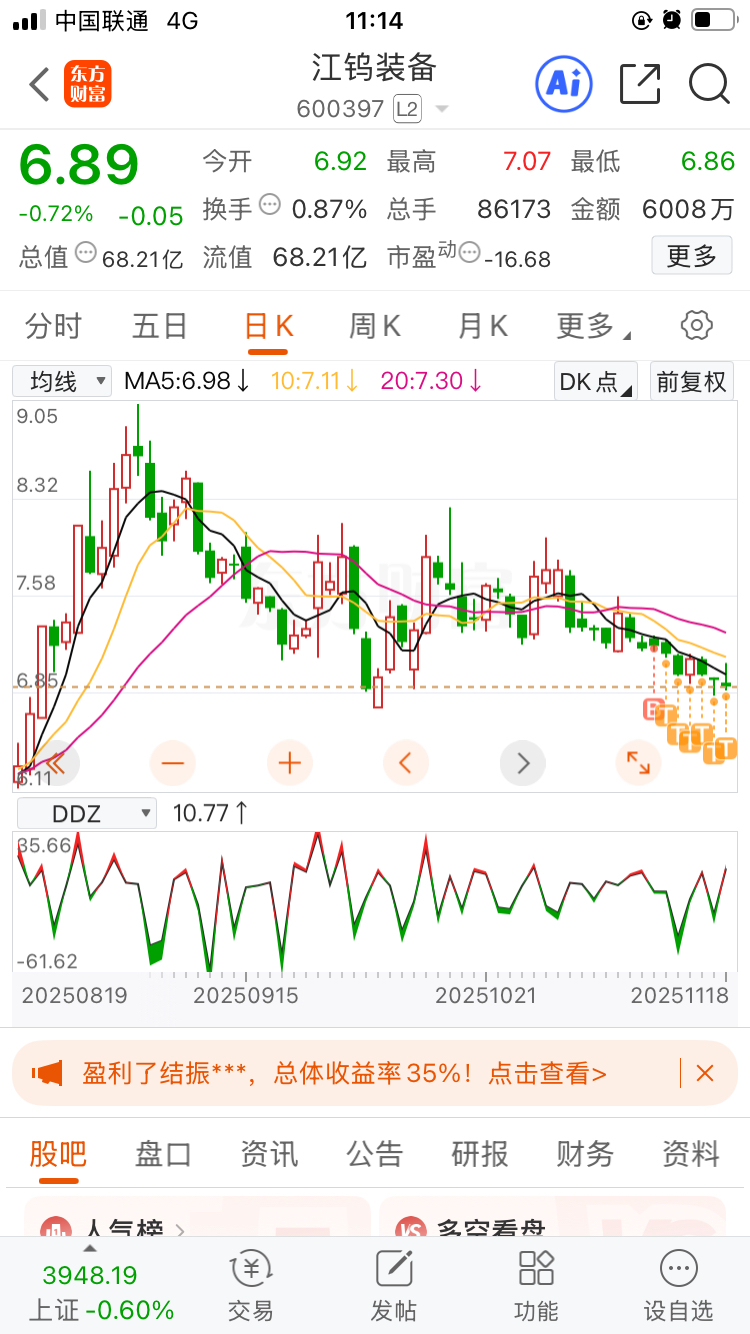 $江钨装备(SH600397)$ 7.18买的,都被套一个礼拜了