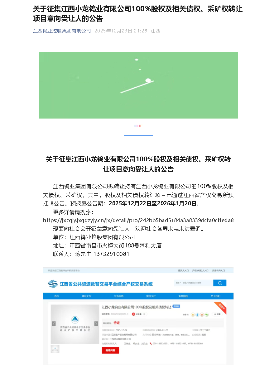 关于征集江西小龙钨业有限公司100%股权及相关债权、采矿权转让项目意向受让人的公