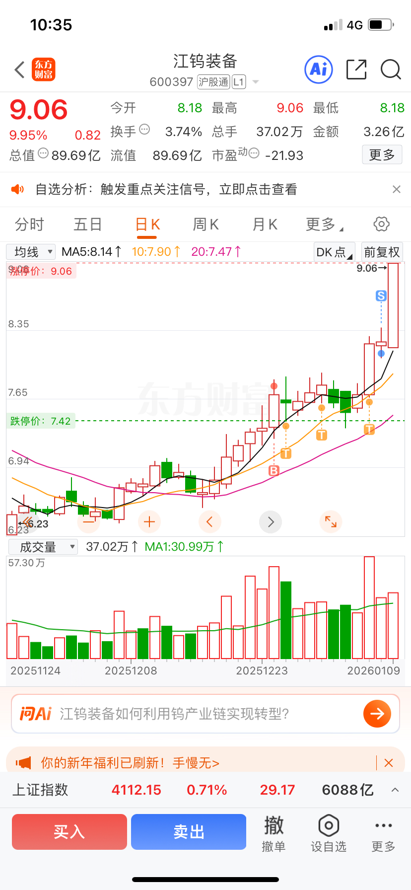 $江钨装备(SH600397)$ 为了进弘讯,昨天买了不上几个板就亏了