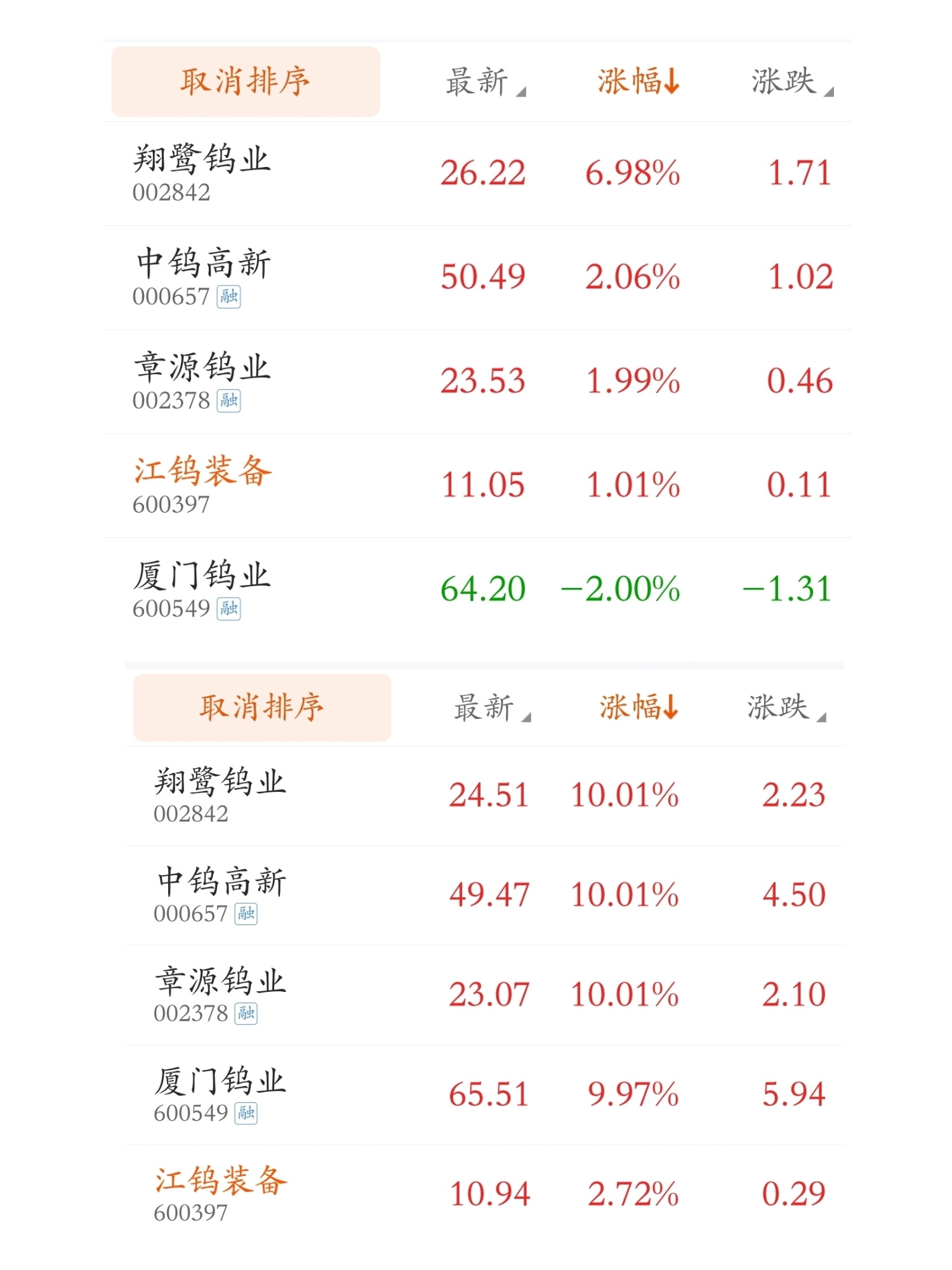 $江钨装备(SH600397)$ 昨天和今天,钨股涨幅