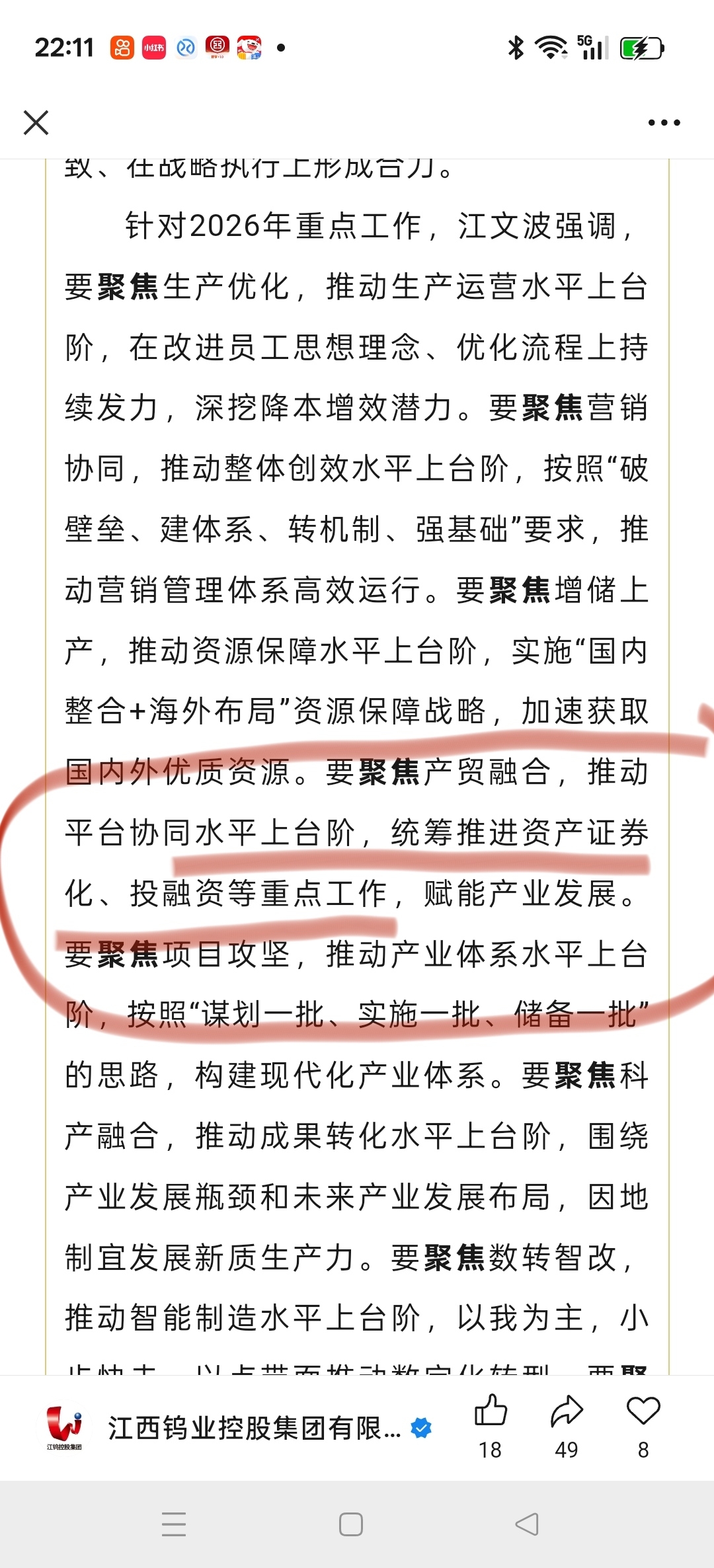$江钨装备(SH600397)$ 2026年的重点工作:资产证券化。今天江钨控股集团发布的2026年工作会议的内容。公众号里面有。
