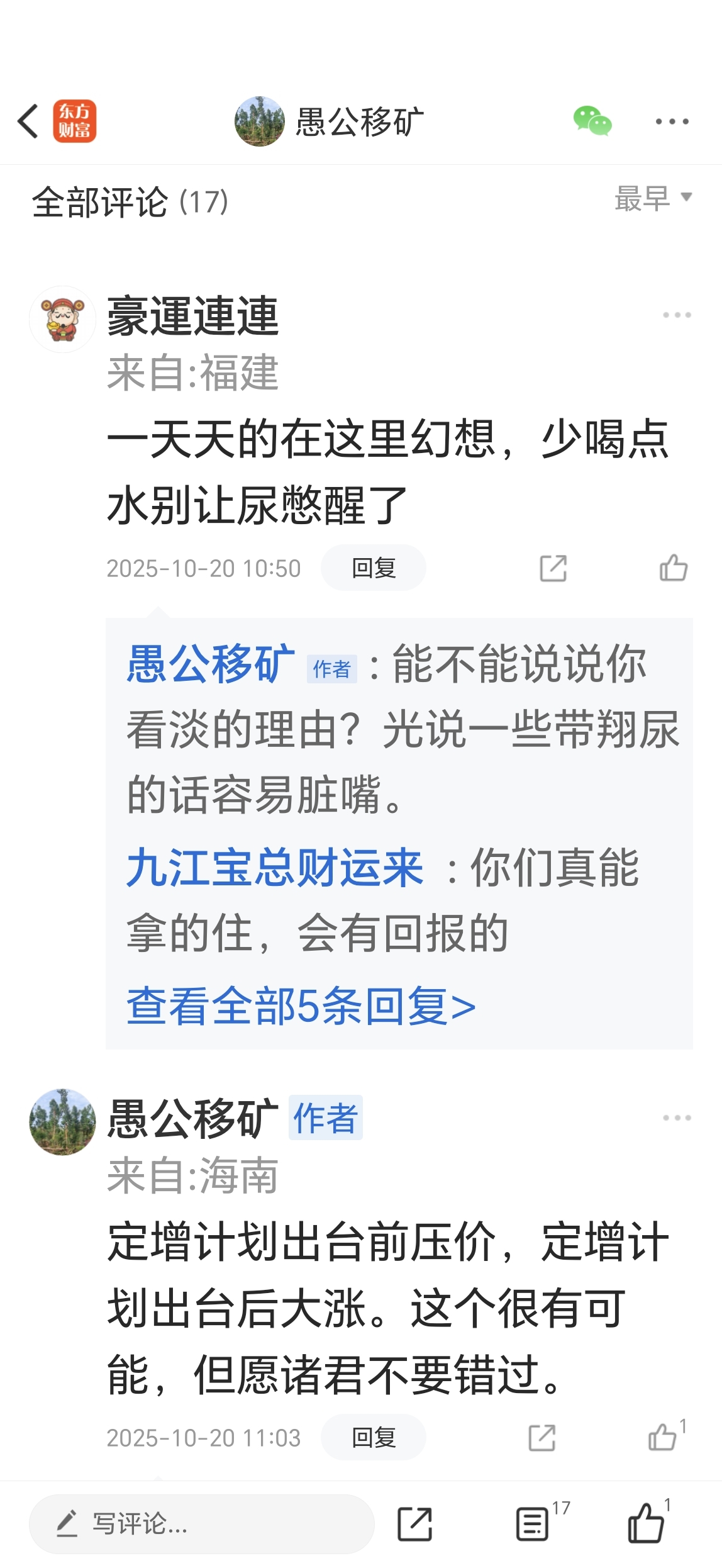 温馨提示: 1.根据《证券法》规定,禁止编造、传播虚假信息或者误导性信息,扰乱证券市场;2.用户在本社区发表的所有资料、言论等仅代表个人观点,与本网站立场无关,不对您构成任何投资建议。用户应基于自己的独立判断,自行决定证券投资并承担相应风险。《东方财富社区管理规定》