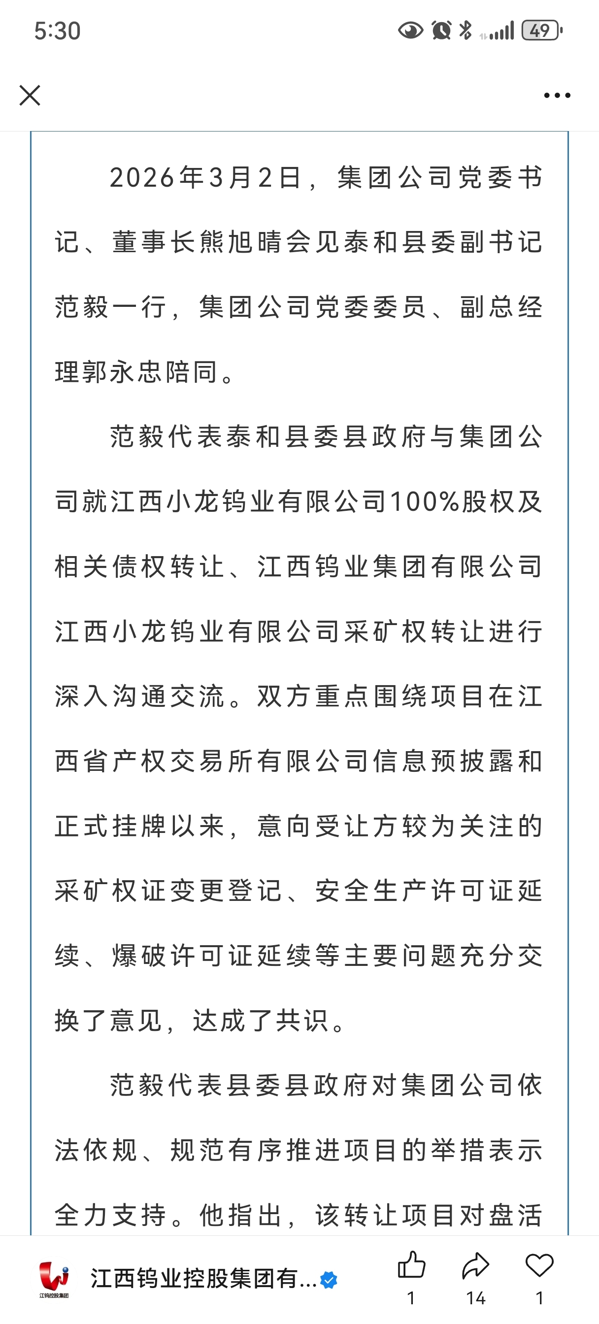 小龙钨业转让公示明天到期。