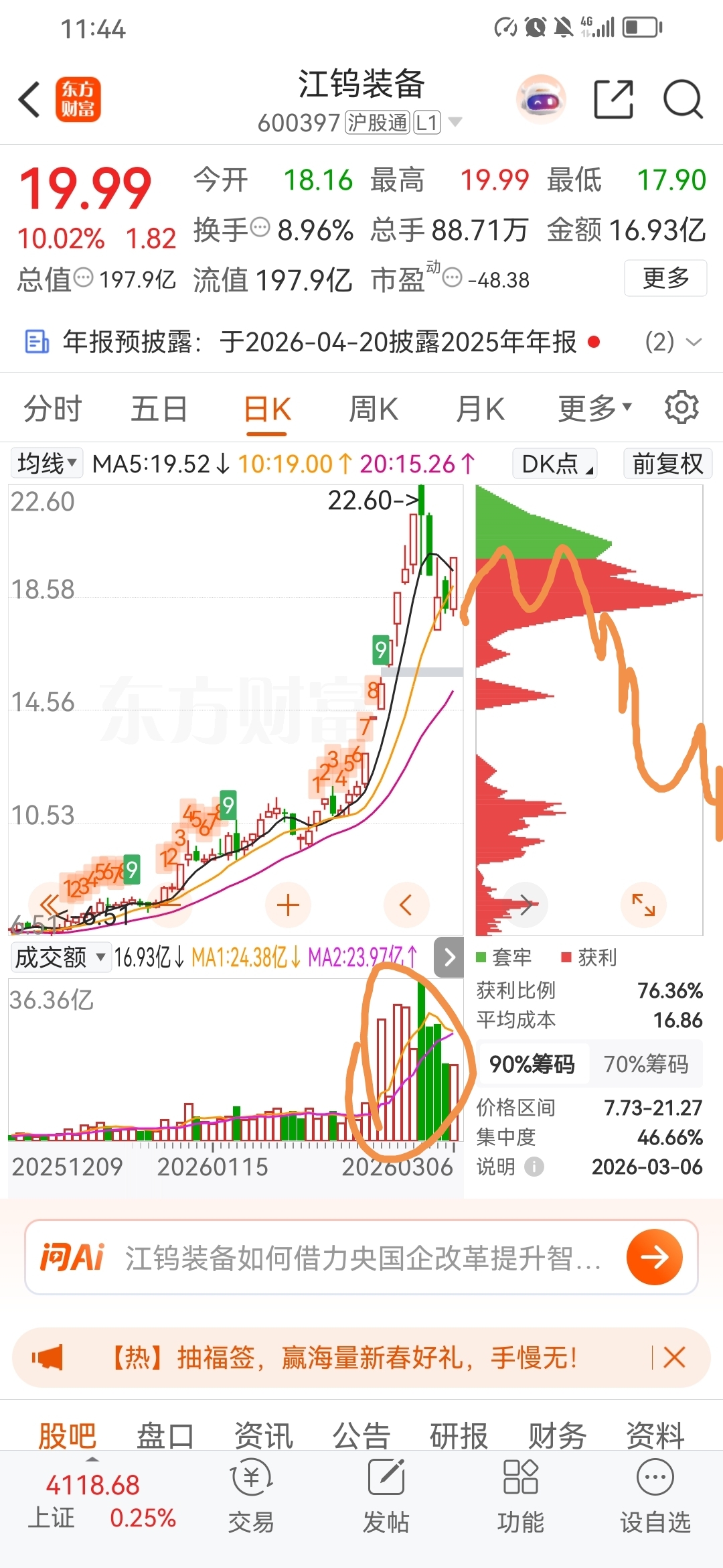 $江钨装备(SH600397)$ 鱼尾阶段出货为主