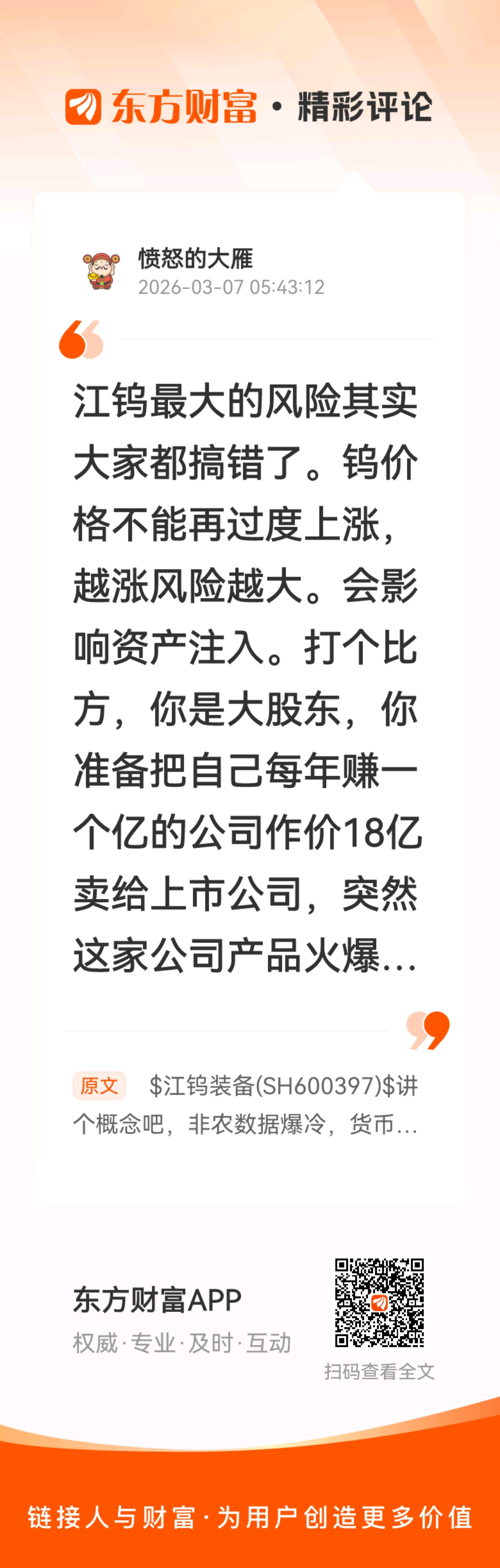 都是国有的,没有国有资产流失的说法//@愤怒的大雁 :江钨最大的风险其实大家都搞错了。钨价格不能再过度上涨,越涨风险越大。会影响资产注入。打个比方,你是大股东,你准备把自己每年赚一个亿的公司作价18亿卖给上市公司,突然这家公司产品火爆大卖,每年能赚5个亿甚至10个亿,你还愿意按照18个亿卖掉吗?所以江钨的最大风险就来自于因钨价过度上涨引发的资产注入失败