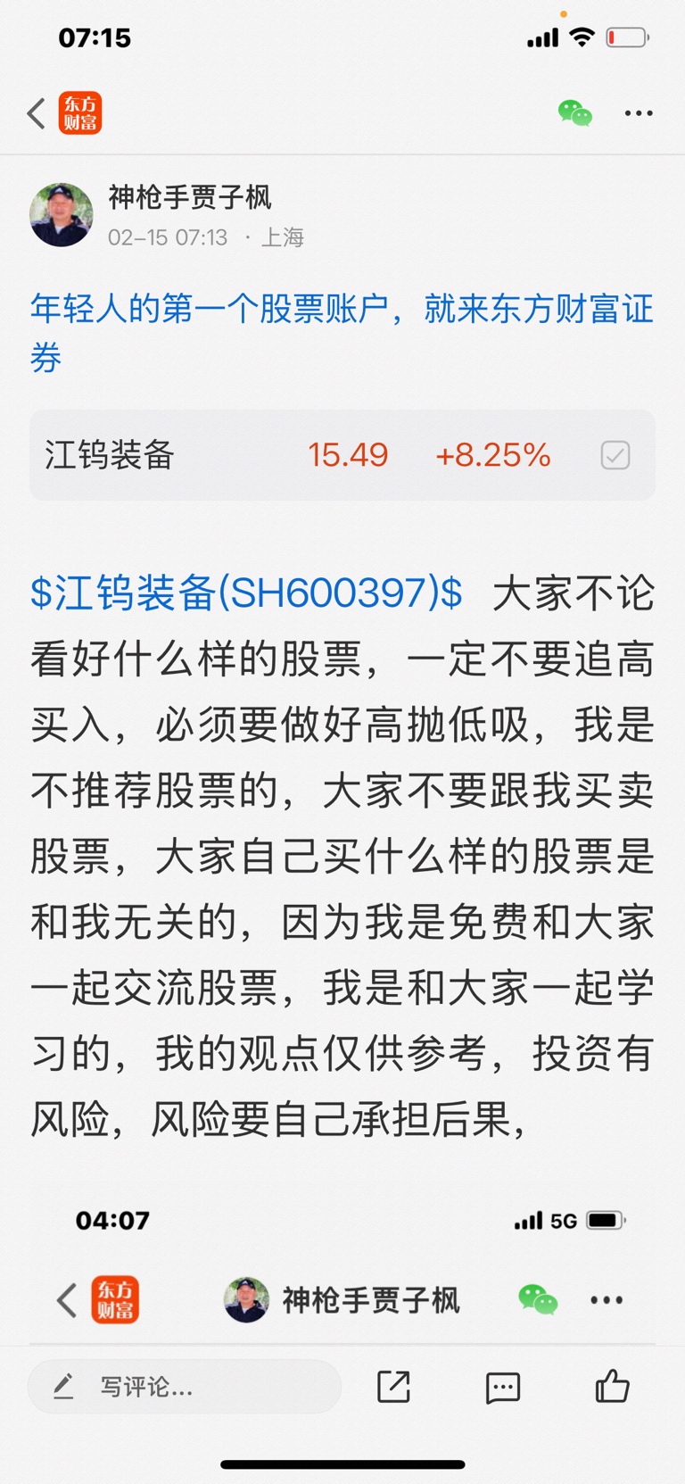 $江钨装备(SH600397)$ 这个是我二月十号五号发表文章看涨的股票,我是不推荐股票的,大家不要跟我买卖股票,大家自己买什么样的股票是和我无关的,因为我是免费和大家一起交流股票,我是和大家一起学习的,我的观点仅供参考,投资有风险,风险要自己承担后果,