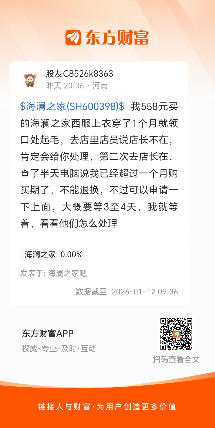 $海澜之家(SH600398)$ 我558元买的海澜之家西服上衣穿了1个月就领口处起毛,去店里店员说店长不在,肯定会给你处理,第二次去店长在,查了半天电脑说我已经超过一个月购买期了,不能退换,不过可以申请一下上面,大概要等3至4天,我就等着,看看他们怎么处理
