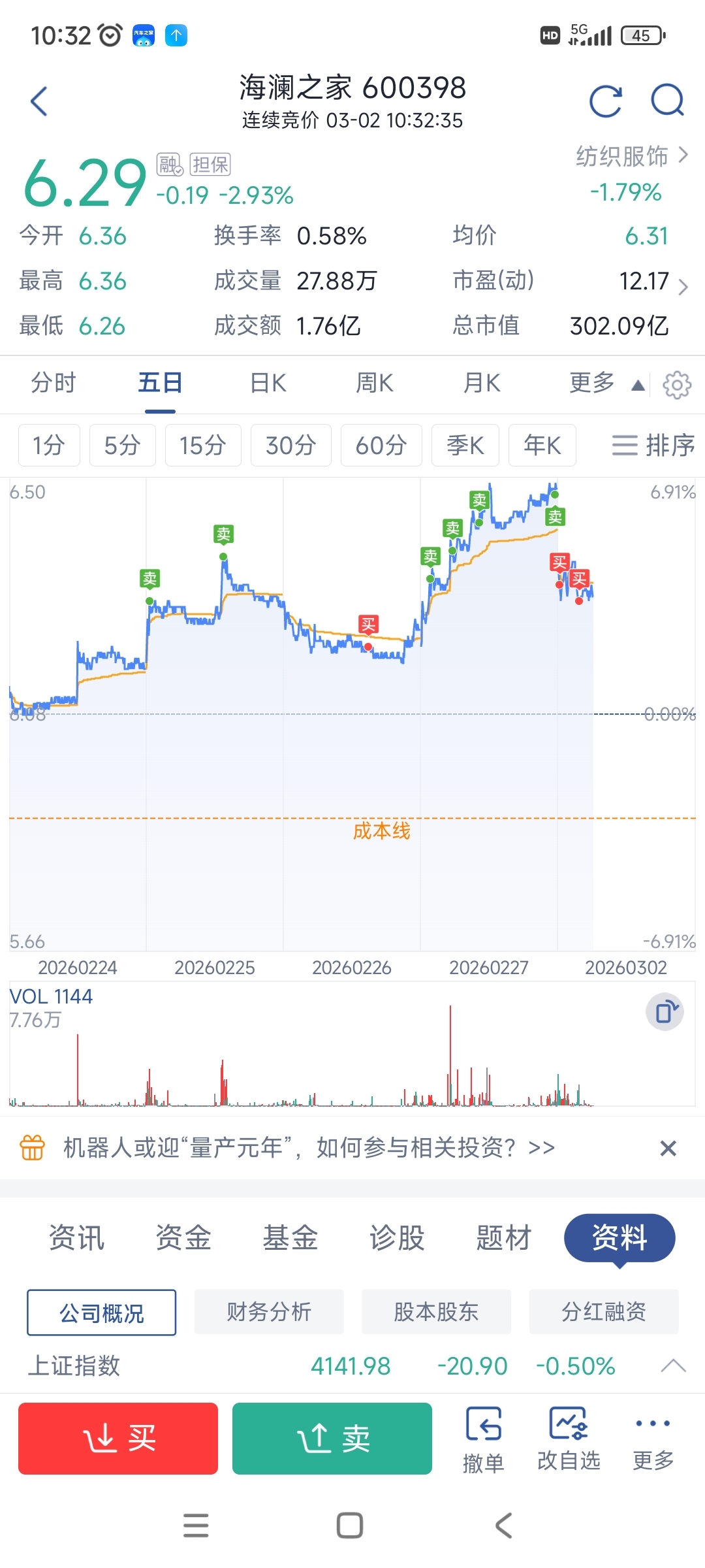 $海澜之家(SH600398)$ 6.36买的,经过这两个月高抛低吸成本做到6元了,不能四拿做过山车