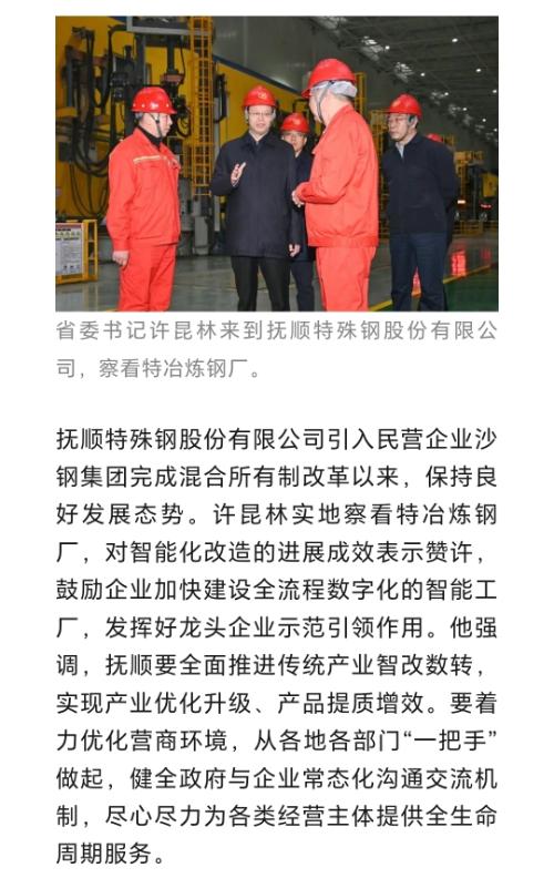 $抚顺特钢(SH600399)$ 抚顺特殊钢股份有限公司引入民营企业沙钢集团完成混合所有制改革以来,保持良好发展态势。许昆林实地察看特冶炼钢厂,对智能化改造的进展成效表示赞许,鼓励企业加快建设全流程数字化的智能工厂,发挥好龙头企业示范引领作用。他强调,抚顺要全面推进传统产业智改数转,实现产业优化升级、产品提质增效。要着力优化营商环境,从各地各部门“一把手”做起,健全政府与企业常态化沟通交流机制,尽心尽力为各类经营主体提供全生命周期服务。