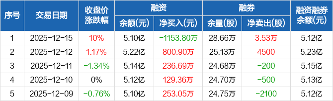 抚顺特钢融资融券信息显示,2025年12月15日融资净偿还1153.8万元;融资余额5.1亿元,较前一日下降2.21%。