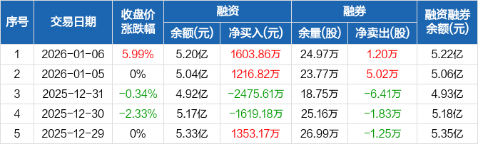 抚顺特钢:融资净买入1603.86万元,融资余额5.2亿元(01-06)