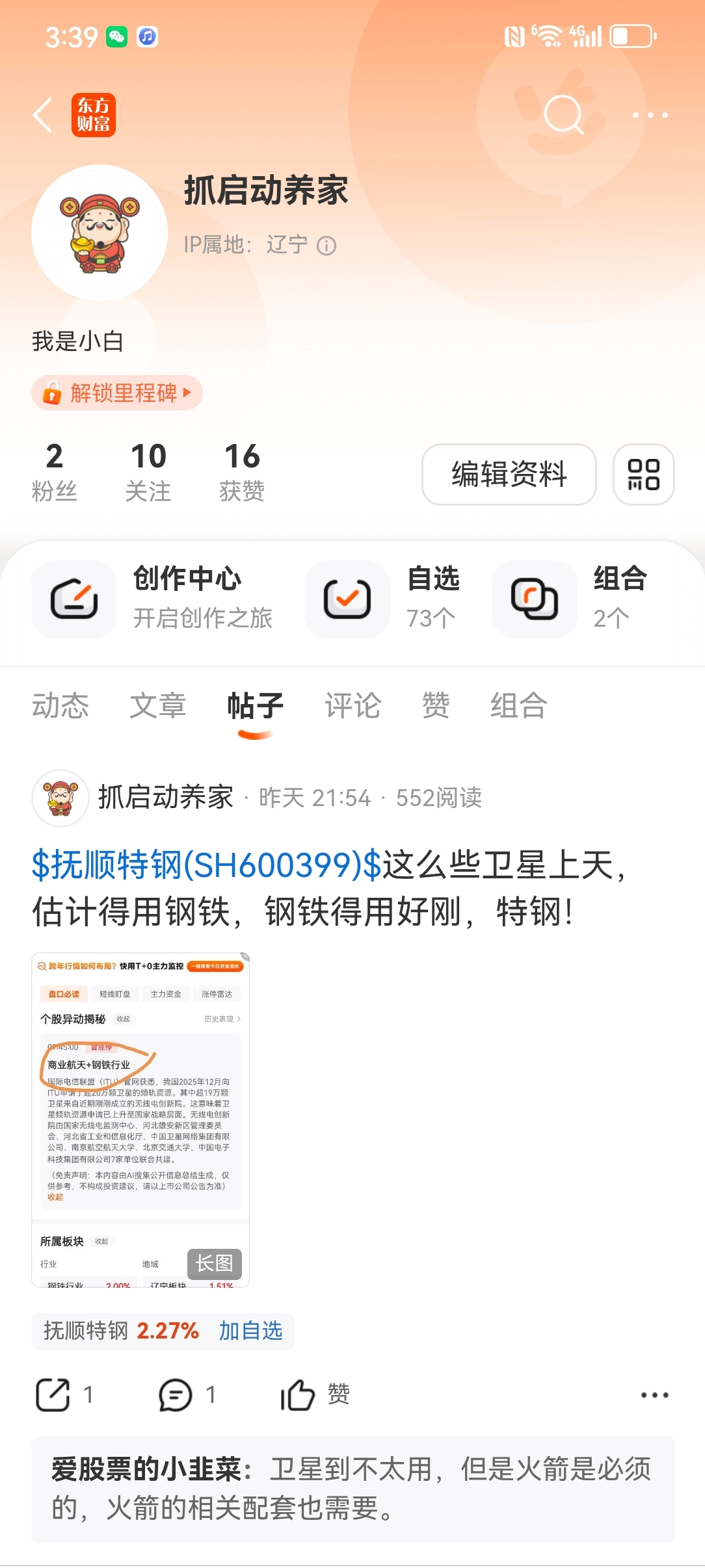 $抚顺特钢(SH600399)$ 跟我想的一样啊,哈哈哈。真有商业航天概念了,不过航天拉稀了,结合龙头首阴战法,明天多少有一些能起来的,咱们这个票还是有机会