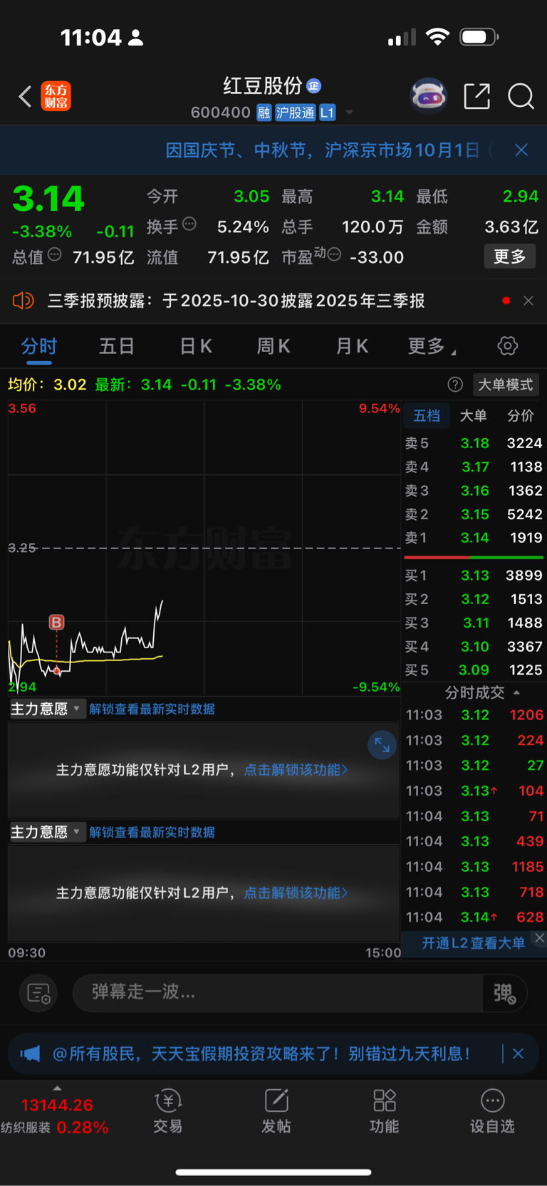 $红豆股份(SH600400)$ 起来吧~豆豆……我都补仓了
