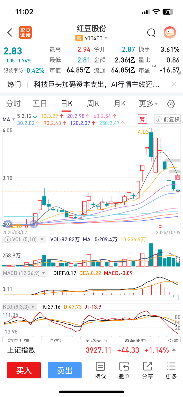 $红豆股份(SH600400)$ 买一点博反弹吧