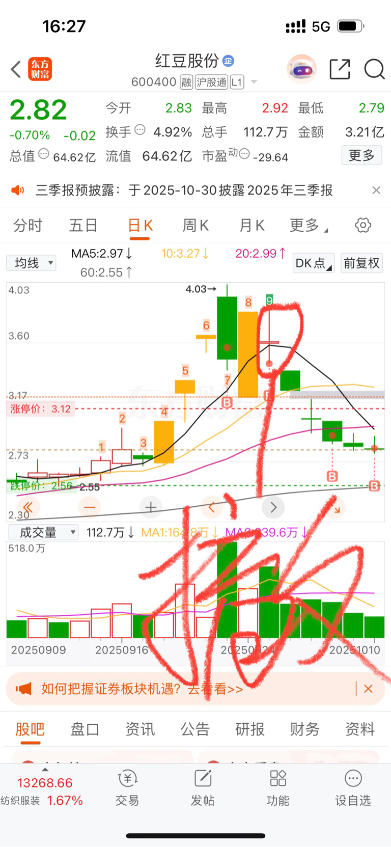 $红豆股份(SH600400)$ 刚在直播间问了主播,主力在我图片标记的位置已经出货跑路了。