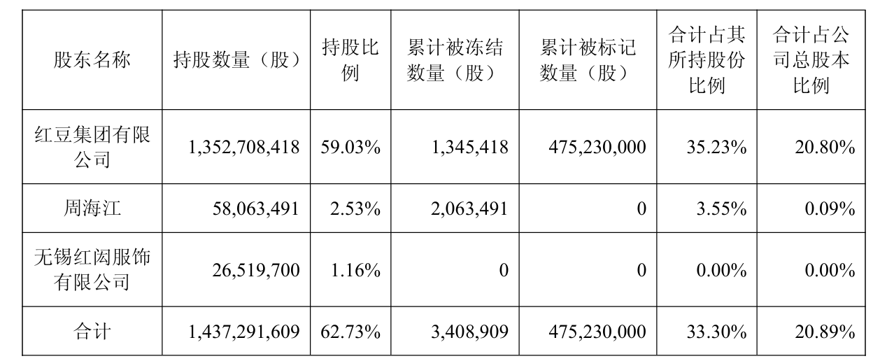 记者观察到,在业绩面临压力之际,红豆股份的控股股东红豆集团超三成持股被司法冻结。