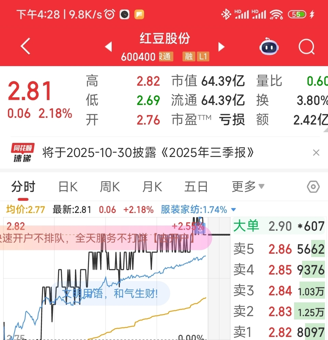 $红豆股份(SH600400)$ 282走啦,这股没有预期啦,后期阴跌,哪里来回哪里去