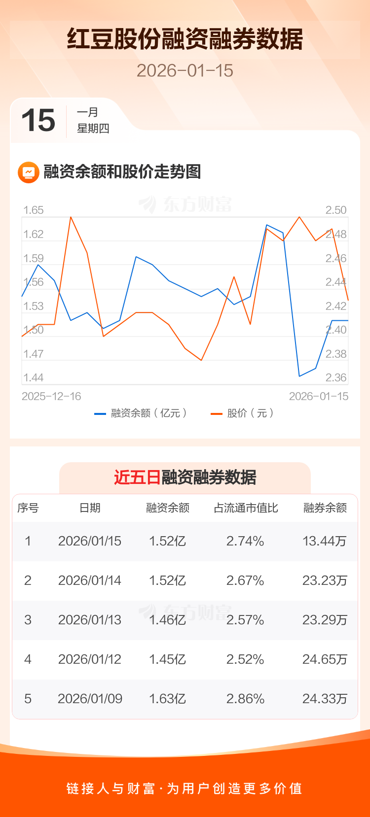 交易所最新数据显示,红豆股份于2026年1月15日获融资买入607.46万元,融资偿还610.63万元,当日融资净偿还3.16万元。目前,该股融资余额1.52亿,占流通市值比例为2.74%。