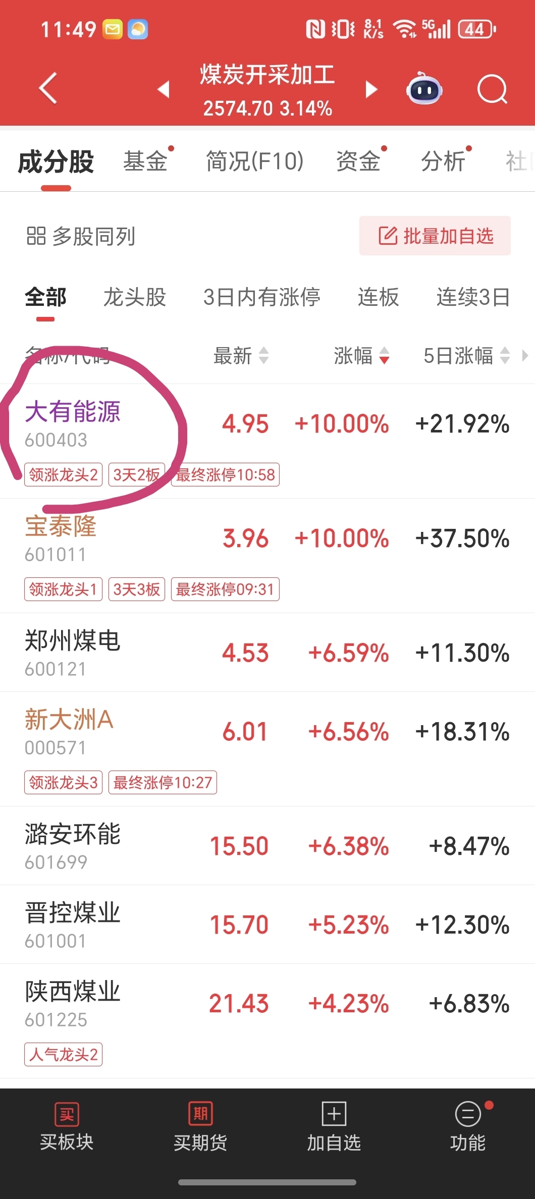 $大有能源(SH600403)$ 能守住今天涨停的都是一等一的高手,大有能源已突破前高4.80打开右侧交易,大有能源作为煤炭能源板块的龙头,现在持仓的家人们只要一起锁仓,煤炭能源的ETF都能把龙头大有能源买到快涨停,大有能源的走势可以参考山子高科$山子高科(SZ000981)$