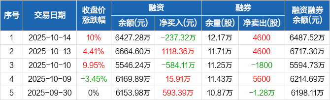 融资方面,当日融资买入2951.93万元,融资偿还3189.26万元,融资净偿还237.32万元。融券方面,融券卖出6300股,融券偿还1700股,融券余量12.17万股,融券余额60.24万元。融资融券余额合计6487.52万元。