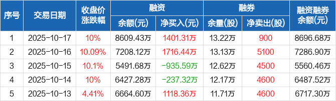 融资方面,当日融资买入7079.21万元,融资偿还5677.9万元,融资净买入1401.31万元。融券方面,融券卖出900股,融券偿还0股,融券余量13.22万股,融券余额87.25万元。融资融券余额合计8696.68万元。